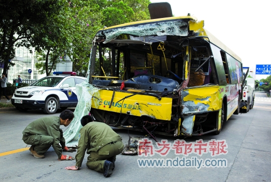 昨日上午8時許,南都記者趕到位于南山區(qū)郎山二路附近的事發(fā)現(xiàn)場時,發(fā)現(xiàn)當(dāng)事公交車車頭受損嚴(yán)重,車前擋風(fēng)玻璃完全破碎,散落在事發(fā)路口,駕駛室嚴(yán)重變形,方向盤和座椅間的空隙被擠壓得不足10厘米。據(jù)現(xiàn)場目擊者稱,事發(fā)后司機就被卡在這個狹小的空間中動彈不得,消防人員趕到后使用液壓器才將其救出。車頭下方靠司機的位置有一大攤血跡。一個路燈也被完全撞倒,泥頭車右后方被撞壞,但司機無礙。